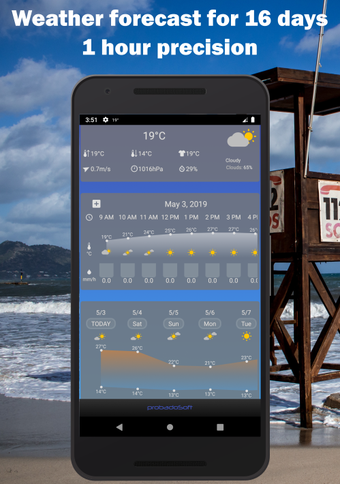 이 앱은 모든 현재 날씨 상황을 간결하고 직관적이며 이해하기 쉬운 형식으로 표시합니다. 현재 위치한 지역의 기온, 강수량, 풍속 및 기압을 표시합니다. 16일간의 예보는 비슷한 방식으로 표시되며, 원하는 데이터 (온도, 바람 및 강수량)가 간결하고 직관적이며 이해하기 쉬운 형식으로 표시됩니다.